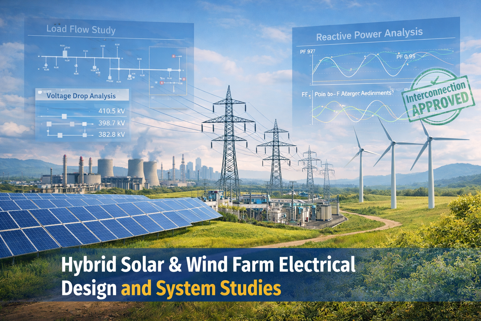An independent power producer required full electrical design and system studies for a hybrid solar and wind facility, including collector systems, substation interface, and POI compliance.